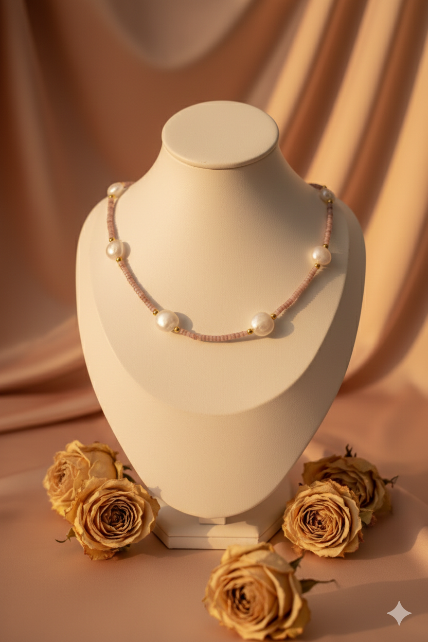 Design: Composição equilibrada entre miçangas de alta qualidade e pérolas que criam pontos de luz orgânicos ao longo da peça.