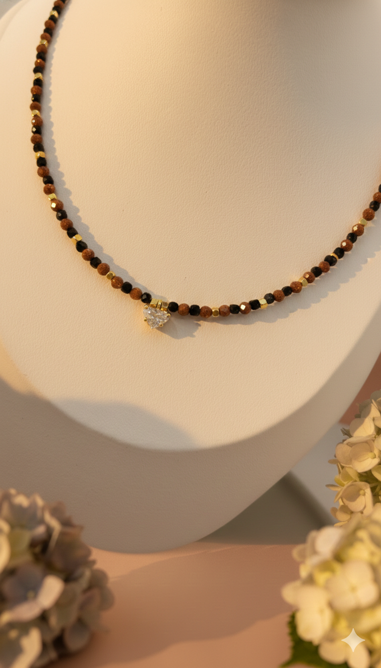 O Colar Terra e Céu é uma joia que celebra os contrastes sublimes do universo. Unindo a profundidade misteriosa do Goldstone Azul — que evoca um céu estrelado — ao calor vibrante da Pedra do Sol, esta peça cria um diálogo visual entre o infinito e a terra. O ponto focal é um pingente geométrico em triângulo, que simboliza equilíbrio e direção. É o acessório ideal para quem busca uma composição sofisticada, carregada de simbolismo e brilho rítmico.
